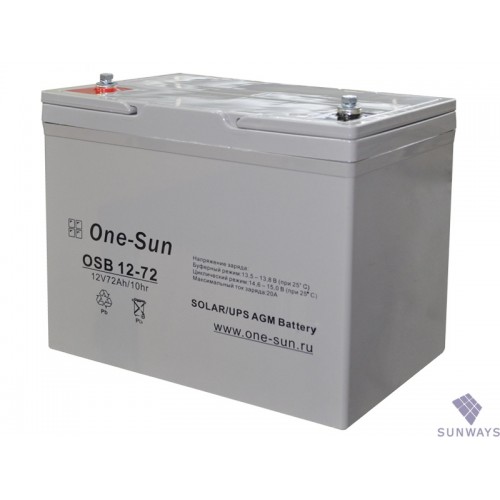 Аккумуляторные батареи One-Sun OSB 12-72 предназначены для работы в солнечных энергосистемах, системах бесперебойного питания и ветрогенераторных установках. Батареи относятся к необслуживаемым, их корпус полностью герметичен и выполнен из негорючего ABS пластика, что исключает возможность выделения кислотных паров и водорода, и позволяет использовать этот аккумулятор внутри жилых и офисных помещений. Аккумуляторы выполнены по технологии AGM (Absorbed Glass Mat) и предназначены для работы как в циклическом, так и буферном режиме. Продолжительный срок службы (10 - 12 лет), улучшенные зарядные характеристики, абсолютная герметизация корпуса и доступная цена, делает аккумуляторные батареи серии OSB одним из лучших предложений на рынке.